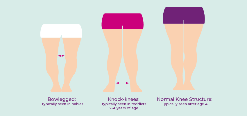 Babies are typically bowlegged because that's the way our legs naturally develop. Over time, our legs straighten as we bear weight and grow taller. Then, children tend to become knock-kneed from ages 2-4. Their legs gradually straighten again to the expected few degrees of knock-knee that we have as adults. "So, bowlegs in a 13-month-old is usually normal, but bowlegs in a 3-year-old is not," said Dr. Rachel Randall, Marshfield Children's pediatric orthopedic surgeon. "On the other hand, noticeable knock-knees in a 3-year-old is usually normal, but significant knock-knees in a 10-year-old requires investigation of an underlying cause." In some cases, influencing factors to abnormal bone growth include:- Genetics