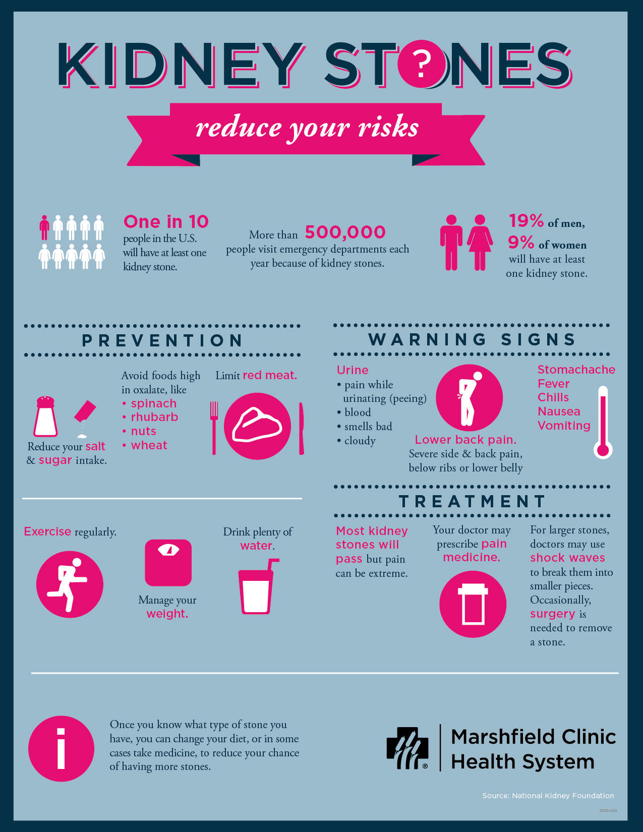 If you think you have a kidney stone, your provider will do a physical exam and imaging tests to diagnose a stone. This can include CT scan, urine test, blood test and stone analysis. After diagnosis, your provider may recommend pain medication and extra fluids to pass the stone naturally, or you may need surgery to remove the stone. If you kidney stones reoccur often, your primary care provider may refer you to a specialist like urology. You also may first see a urologist or nephrologist, depending on the care you need. Your specialist will develop a treatment plan individualized with you to prevent future kidney stones. Download the chart below for information that can help keep your kidneys clear of those painful pebbles, while offering insight into symptoms and treatment, too.